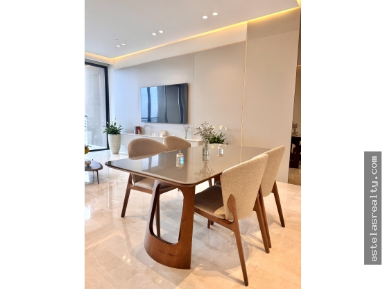 El apartamento tiene una superficie de 192 mts2 aproximados distribuidos en sala-comedor, 3 dormitorios con sus baños, la habitación principal con su walking closet, todas las habitaciones mirando al mar, y al club de yates, cocina abierta con isla y dayunador, cuarto de servicio con su baño, lavandería, balcón.